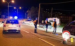 These three organisations have been providing law enforcement in San Marino since a statute in 1987, which redefined their roles.[3] Their responsibilities were further defined by regulations for the Gendarmerie and the Fortress Guard, which was approved by the Government of San Marino in 2008.[4] Under the 2008 regulations the Gendarmerie and the Fortress Guards are responsible for policing, criminal investigation, national penitentiary, changing the guard, border patrol, customs control, personal protection, and national security, while the Civil Police are tasked with tax collection, domestic security, traffic control, and civil defence.[1] All three agencies are subordinate to the Secretary of State of Home Affairs.[5]