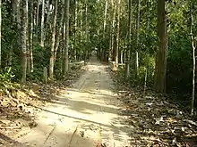 The forest of Lawachara is of a mixed type, with the understory usually composed of evergreens, including Quercus, Syzygium, Gmelina, Dillenia, Grewia, and Ficus. The upper canopy, meanwhile, is mainly composed of tall deciduous trees including Tectona, Artocarpus chaplasha, Tetrameles, Hopea odorata. Toona ciliata, and Pygenum. The original indigenous mixed tropical evergreen vegetation had been removed or replaced in the 1920s.[7] It is now mostly secondary forest with small remnant areas of rich primary forest.[2] In the undergrowth are bamboo groves of jai bansh (Bambusa burmanica) and muli bansh (Melocanna baccifera),[6] as well as several fern species and other epiphytes.