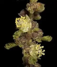 L. densiflora is a perennial shrub/herb, growing to a height from 0.07 to 0.6 m.[1] The stems are hairy.[1] The leaves are irregularly lobed, 10 to 40 mm long and 5 to 20 mm wide, with stellate hairs.[1] The flowers have both a calyx and a corolla, and are yellow to cream and seen between July and October.[1]