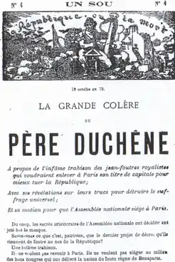 Le Fils du Père Duchêne (French: [ pɛʁ dyʃɛːn]; "The Son of Old Man Duchesne") is the title of a newspaper which appeared in France during revolutionary periods of the nineteenth century. It borrowed its title from the original Père Duchesne published by Jacques Hébert during the French Revolution. After Hébert's death, the title reappeared with all sorts of variations (Old Lady Duchesne, Son of Père Duchêne, etc.) from the 1790s on, notably during the Revolution of 1848 and the Paris Commune of 1871 (in editions by publishers Eugène Vermersch, Maxime Vuillaume, and Alphonse Humbert).