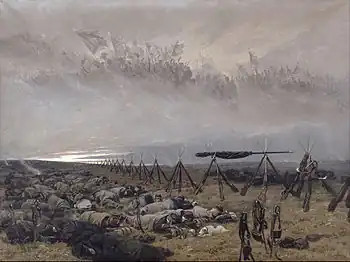 Le Rêve is a painting depicting the military - the specialty of its creator, Édouard Detaille.[3] It shows an encampment of sleeping French soldiers that continues as far as the eye can see. The soldiers are young conscripts of the French Third Republic who are taking part in summer exercises, probably in Champagne.[3] They are dreaming of the glory of their predecessors, and of exacting revenge following their country's defeat in the Franco-Prussian War.[3]