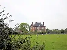 Lea Hall is a former country house standing to the northwest of the village of Wimboldsley, Cheshire, England. It dates from the early part of the 18th century, and was built for the Lowndes family. During the 19th century the house was owned by Joseph Verdin.[1] Additions, including dormer windows, were made in the 19th century. During the 20th century the house was divided into three flats. The house is constructed in red brick with ashlar dressings and a tiled roof. It is in two storeys, with an attic and a basement.[2] The roof is large and hipped, with a viewing platform.[1] The entrance front is symmetrical, in five bays, the central bay protruding slightly forward. This bay contains a doorway with a swan's nest pediment decorated with scrolls, and containing a crest with the initials J V (for Joseph Verdin).[2] The authors of the Buildings of England series describe the house as a "perfect brick box, delightful if just a little funny to look at".[3] It is recorded in the National Heritage List for England as a designated Grade II* listed building.[2]