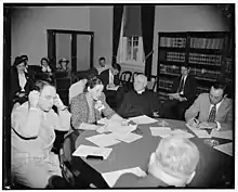 Conservatives who opposed the 1935 National Labor Relations Act accused LWS of conspiring with the National Labor Relations Board (NLRB) and later turned to accusing LWS of being a Communist front.[31] J.B. Matthews accused LWS of being a Communist organization in 1939.[32] Matthews' accusation was also borne out of personal resentment against LWS, which had supported a strike at the Consumers' Research (CR) group that Matthews led.[32] Representative Martin Dies worked with Matthews to charge LWS as an "Un-American" organization under the auspices of the House Un-American Activities Committee (HUAC).[32] Mary Catherine Phillips, who was also associated with CR, accused LWS of being "stooges" of the Communist Party in 1940.[33] These accusations happened in spite of the fact that LWS was always specific about wanting to create a "more inclusive democracy."[34]