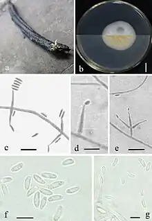 Lecanicillium cauligalbarum. a Synnemata emerged from the corpse of a stemborer (Lepidoptera) b Culture plate, showing the front (upper) and the back (lower) of the colony, cultured on PDA medium c–e Phialides solitary or in 2–3 whorls f–g Conidia. Scale bars: 10 mm (b, c, e), 5 μm (d, f, g)
