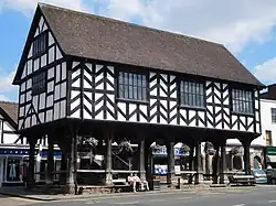 In the early 17th century, a market trader, John Phillips, launched an initiative to demolish an existing row of buildings in Shoppe Row and erect a market hall in their place.[3] The building, which has been attributed to the master mason, John Abel, was designed in the Tudor style using half-timbered construction and was completed in 1617.[4][5][6] The design involved a symmetrical main frontage with seven bays facing onto the High Street; the building was open on the ground floor, so that markets could be held, with a storeroom for grain on the first floor. The first floor, which was jettied out over the pavement, was supported by 16 oak posts and was accessed by a wooden staircase at the north end of the building.[7] The first floor was fenestrated, on the west side, by three six-light mullioned and transomed windows and the half-timbering was executed in a Herringbone pattern.[2]