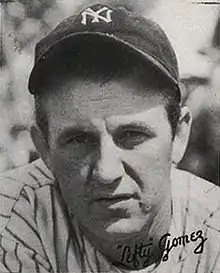 The New York Yankees purchased Gomez from the Seals for an estimated $39,000.[3] He reported in at 6 feet 2 inches (1.88 m) and weighing in at 147 pounds (67 kg). This scared many people that he was not ready for the big leagues. Gomez made his major league debut on April 29, 1930. He pitched in only 15 games and finished the season with a 2–5 win–loss record, a 5.55 earned run average (ERA). Coming into the 1931 season, Gomez had good pitching velocity, but the Yankees were concerned about the pitcher's slender frame of 6 feet 2 inches (1.88 m) and 155 pounds (70 kg). Following a common medical strategy of the time, the team had most of his teeth extracted; they also had him drink three quarts of milk daily and gave him an unlimited meal allowance for road games. Gomez registered the second-best ERA in the American League in 1931.[4]