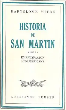 The unitarian Bartolomé Mitre wrote a series of biographies, and established Bernardino Rivadavia as a national hero of Argentina. However, as Rivadavia was a statesman without a military career, Mitre sought to create a military national hero, to complement Rivadavia, and wrote a biography of Manuel Belgrano. This attempt did not prove completely effective, as Belgrano had grave defeats in his military career.[5] Thus, Mitre wrote a biography of San Martín, "Historia de San Martín y de la emancipación sudamericana" (Spanish: History of San Martín and the South American emancipation). By that time, several accounts of San Martín were being written at many countries: Valentín Ledesma from Lima wrote in 1853 about San Martín's campaign in Peru, and Benjamín Vicuña Mackenna from Chile wrote in 1856 about the Chilean War of Independence.[6]