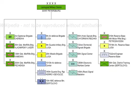 The Leningrad Military District was a military district of the Armed Forces of the Russian Federation. In 2010 it was merged with the Moscow Military District, the Northern Fleet and the Baltic Fleet to form the new Western Military District. In December 2022, Defense Minister Sergey Shoigu proposed to reestablish it along with the Moscow Military District,[1] a decision confirmed in June 2023 by Deputy Chief of the General Staff Yevgeny Burdinsky.[2] On December 17, 2023 Vladimir Putin announced plans to recreate the Leningrad Military District as a reaction to Finland joining NATO.[3]