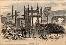The Lenoir Cotton Mill was one of several enterprises established by early settler and entrepreneur William Ballard Lenoir (17751852). Lenoir moved to the area in 1810 after his father, General William Lenoir, deeded to him the 5,000-acre (2,000 ha) tract of land comprising what is now Lenoir City. The younger Lenoir established the Lenoir Manufacturing Company in 1817, which engaged in multiple agricultural and industrial enterprises throughout the 19th century.[1] The cotton mill was completed in the early 1830s and gradually expanded in subsequent decades. During the U.S. Civil War, Union soldiers destroyed parts of the estate of the Confederate-leaning Lenoir family, but spared the mill due to William Ballard Lenoir's son Benjamin's Mason affiliations. After the Lenoir family sold the mill in the 1890s, it operated variously as a hosiery mill and later as a flour mill.[3]