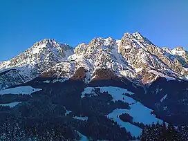 The Leogang Mountains[1] (German: Leoganger Steinberge, lit. "Leogang Rock Mountains") are a mountain range in Austria in the state of Salzburg and form part of the Northern Limestone Alps within the Eastern Alps. They are located between the Lofer valley, Saalfelden and Leogang and, together with the Lofer Mountains to the northwest, form two mountain massifs that are separated by the saddle of the Römersattel (1,202 m), but which the Alpine categorisation of the Eastern Alps defines as a single sub-group (the Lofer and Leogang Mountains). The Leogang Mountains are separated from the Kitzbühel Alps to the south and the Steinernes Meer to the east by deeply incised valleys. Typical of the Steinberge are high plateaux with steep sides and sharply undulating high cirques.