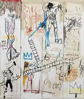 Jean-Michel Basquiat primarily used texts as reference sources for his artwork.[1] He drew inspiration from the medical book Gray's Anatomy, which had been given to him by his mother as a child while he recovered from a car accident in the hospital.[2] Leonardo da Vinci's Greatest Hits references Renaissance man Leonardo da Vinci's anatomical drawings of body parts and graphic notations. Basquiat brought symbolism into this work with a depiction of African American folk hero John Henry on the lower left.[3] Among the scattering of words written across a white collage, Basquiat's signature three crown motif appears three times. This painting "is almost a summary or encyclopedia of his work," said curator Kelly Baum.[4]