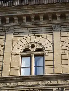 The design of the façade of the Palazzo Rucellai (1446–51) was one of several commissioned by the Rucellai family.[19] The design overlays a grid of shallow pilasters and cornices in classical style onto rusticated masonry, and is surmounted by a heavy cornice. The inner courtyard has Corinthian columns. The palace introduced set the use of classical building elements in civic buildings in Florence, and became very influential. The work was executed by Bernardo Rosselino.[10]
