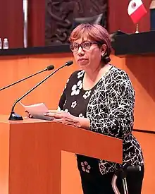 In the 2018 federal elections, she was nominated by the Democratic Revolution Party as a senator of the republic for the state of San Luis Potosí. After the elections, she obtained the first formula seat as of September 1, 2018 in the LXIV Legislature of the Congress of the Union. Within Congress, she is president of the indigenous affairs commission.[2] On May 28, 2019, she left the PRD bench to join the Ecologist Green Party of Mexico (PVEM).[4]