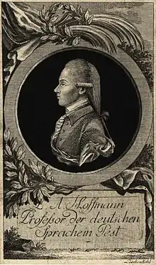 In 1782 he moved to Vienna where he entered the service of the Schönfeld publishing business. The coming to power of a new emperor in 1780 had opened the way to a surge in "Enlightenment" thought. Writing either anonymously or under one of a large collection of pseudonyms Hoffmann produced a number of leaflets and contributed to various news-sheets. He would in 1783 become a freemason: much the political tone of his writing during this period was correspondingly radical.[3] His most important platform between 1782 and 1784 was "Weekly Truths for and about Priests in Vienna" ("Wöchentlichen Wahrheiten für und über die Prediger in Wien"), which purported to assess the sermons preached in Vienna churches against the standards of the "Josephine enlightenment" being feverishly rolled out by the state authorities.[4] He took a job as secretary to Lord von Gemmingen-Hornberg who in 1783 became leading writer on "Weekly Truths". It was through von Gemmingen that he came into contact with Vienna freemason and "Illuminati" circles. In April 1783 he was accepted as a member of the "For Good Actions" ("Zur Wohltätigkeit") freemason lodge which was newly established by von Gemmingen and of which, in November 1783, Hoffmann became secretary.[5] Subsequently, there was a falling out between Hoffmann and von Gemmingen. The origins of their differences are not entirely clear.[6] Hoffmann, as lodge secretary, alleged that von Gemmingham had failed to pay his "Honorarium" (membership subscription) and there was talk of broken promises.[6] In 1785 Hoffmann moved away from Vienna, having used his friendship with the well connected diplomat-librarian Gottfried van Swieten, who was much involved in the emperor's education reforms, to obtain a professorship of the German language downriver at Pest University, where he remained till 1790.[3]