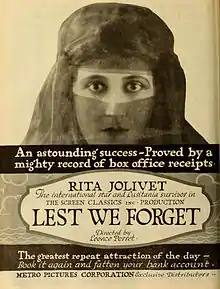 Lest We Forget is a 1918 American silent World War I espionage drama film directed by Leonce Perret and produced by and starring Rita Jolivet. The film was released by the Metro Pictures company. While the picture is essentially a spy film, it may also be considered a propaganda film popular during World War I.[1][2]