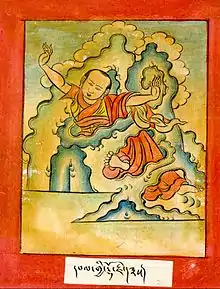 Palgyi Dorje was Padmasambhava's student. According to Tibetan tradition, King Langdarma persecuted Buddhism in Tibet. To end this persecution, Pelgyi Dorje traveled to the King's palace, where he surprised the King and killed him with a bow and arrow. Escaping by turning his black cloak inside out to show its white lining and riding his white horse into the river to wash off the charcoal with which he had made it appear black,[1] he then fled to Amdo (Qinghai) or Yerpa, where he lived out the rest of his life as a recluse.