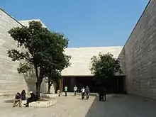 The Museum is stone-clad[5] with Iranian travertine stone[6] and is surrounded on three sides by a man-made lake.[5] It is built around an abstract geometrical design,[4] comprising four blocks, all 18 m wide but different heights, and lengths.[6] Five internal courtyards punctuate the space, connecting the galleries and allowing the entry of daylight.[5] Visitors enter the building via a bridge across the lake, echoing the aquaculture and irrigation systems of the Liangzhu people.[5]