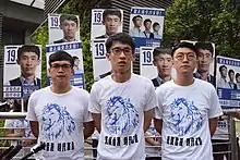 Hong Kong Indigenous politicians at a campaign press conference in 2016, wearing shirts featuring the slogan