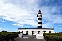 The Lighthouse of Ponta da Barca (Portuguese: Farol da Ponta da Barca) is a beacon/lighthouse located along the 24 metres (79 ft) cliffs of Ponta da Barca, near the hamlet of Bom Jesus, civil parish of Santa Cruz da Graciosa on the island of the same, the Portuguese archipelago of the Azores. Immediately near the lighthouse, is the emblematic baleia de pedra (whale rock), a curious geological basaltic rock that has resisted erosion, in the shape of a whale. The lighthouse includes a symmetrical single-floor building, and a 23-metre (75 ft) high cylindrical tower that extends its lamp to 71 metres (233 ft) above the ocean surface. It is considered a second-order lighthouse, which began operating on 1 February 1930.