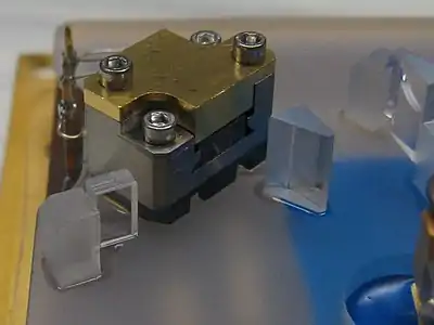 Photograph shows the technique used to mount optics in a Lightwave Electronics single-frequency frequency-doubled laser. The optic in the left foreground is bonded with a thin layer of UV-curing adhesive to a support block, also made of glass, which is bonded to the platform. This design approach allows 5 degrees of freedom for the optic, with a thin adhesive bond.[23]
