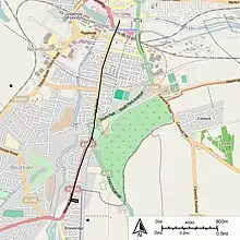 The tramway replaced the horse tram service previously provided by the Lincoln Tramways Company. The assets of this company were purchased by the Lincoln Corporation in July 1904 for the sum of £10,488[2] (equivalent to £1,202,200 in 2021).[3] It was a single route from Bracebridge, along Newark Road and High Street to Cornhill. The depot was on the corner of Newark Road and Ellison Street at SK 9688 6851. The depot building survives to this day.