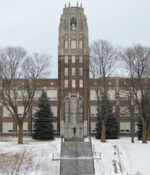 Lincoln High School is a public high school that serves the city and its immediate suburbs of Manitowoc, Wisconsin. USA. The school serves students in grades 9 through 12, with an enrollment of roughly 1,200. Constructed in 1923, Lincoln High School was designed by the Chicago-based firm of Perkins, Fellows, & Hamilton and its campus plan was designed by Jens Jensen. It is located on Roeff's Hill, along scenic Lake Michigan. The gothic-style building occupies 19 acres (7.7 ha) on the south side of the city. School colors are red and white. The school's official team name is the "Shipbuilders", however, "Ships" is most often used.