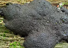 The plasmodium is sepia-toned, brown-black or black. The fruiting body is usually pseudoaethalioid, occasionally aethalioid or on rare occasions even sporangiate. The fruiting bodies form dense groups which are mainly sessile or, rarely, borne on a stipe. The single sporangia are cylindric and create a spotted to cushion-shaped aethalium with a diameter from 1 to 15 cm (0.39 to 5.91 in) and a thickness from 2 to 10 mm. Its thickened, black or dark brown surface is composed of incompletely developed peridium walls and spores, and covers the ochre- to olive-brown interior. The endings of the single sporangia are slightly rough up to distinctly curved outwards and spherical. Their diameter is from 0.4 to 0.8 mm.[1]