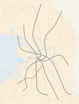 Krasnoselsko-Kalininskaya line (Russian: Красносе́льско-Кали́нинская линия), or simply line 6, is a passenger rapid transit line of the Saint Petersburg Metro system currently under construction. It is identified by the livery colour of brown. Train service is expected to begin in 2024 with 2 stations initially, and 4 more stations inaugurated later in 2026 or 2027. The line lies from Krasnoselsky District, then travels northeastward, with interchange stations allowing passenger transfer with line 1, line 2 and line 5.