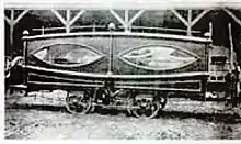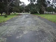 After a lengthy debate, Linwood Cemetery was connected to the Christchurch tramway system. Approval for construction of the line was given in April 1885.[8] Construction began on 26 November 1885 at Latimer Square and was completed by March 1886. The line was officially opened on 23 April 1886. Initially, it was the 'end of the line' from the city centre and people had to walk across or around the cemetery to connect with the tram line to New Brighton, which was run by a different company. By January 1887, the two lines had been connected.[9] The city council had a tram hearse built for up to four coffins, with the intention of providing cheaper form of transport to the cemetery than what funeral directors would charge. The scheme was a failure and it is believed that the tram hearse was never used. In 1888, a council committee recommended that the rails into the cemetery be removed again and used elsewhere, but this was never acted on, and the rails, although sealed over, are still faintly visible. The tram hearse was bought by Samuel Paull Andrews for £3 and used as an explosives store in his St Andrew's Hill quarry.[10]