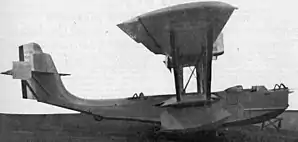 Aft of the rear step, the hull became slender and then blended into a tall fin.[2] Some images show the rudder unbalanced and the same height as the fin[4] but others show a taller balanced rudder.[3] At some point after[5] the rudder was balanced, small auxiliary fins were added to the tailplane tips.[3] The tailplane was mounted over halfway up the central fin, each side braced from below by a pair of parallel struts.[3]