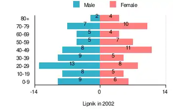According to the 2002 Poland census, there were 126 people residing in Lipnik village, of whom 52.4% were male and 47.6% were female. In the village, the population was spread out, with 20,6% under the age of 18, 34,9% from 18 to 44, 22.2% from 45 to 64, and 22.3% who were 65 years of age or older.[2]