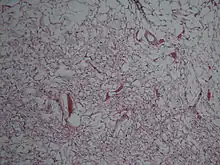 Grossly, it has a pale yellow, myxoid cut surface with small cystic foci.[3]