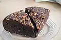 Mokkapalat Brownies or sponge cake topped with chocolate icing and sprinkles