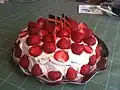 Mansikkakakku Traditional meringue strawberry cake prepared with mixed strawberries, sugar, egg whites, heavy cream, vanilla and almonds. Typically served during midsummer