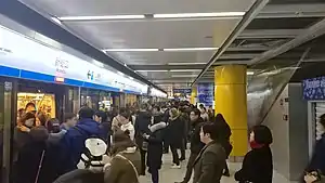 The system's largest and busiest station is Xinjiekou, the transfer station between Lines 1 and 2, with 24 officially marked exits[31] and a floor dedicated to retail and commercial activities.[32] Xinjiekou attracted 158,200 passengers on New Year's Eve in 2015[33] and 130,500 daily passengers in 2016 during China's week-long National Day holiday.[34] The metro stations in Nanjing South Railway Station and Nanjing Railway Station carried 102,000 and 99,800 daily riders respectively during the same holiday period.[34] Other high-ridership stations include Daxinggong, Sanshanjie, Fuzimiao, Gulou, and Xiamafang.[35][36][37]