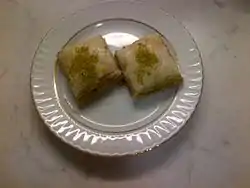 Phyllo pastry | A type of phyllo pastry filled with finely chopped nuts and soaked in sharbat syrup. |