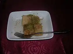 Tel kadayif dough filled with a layer of cheese and soaked in sharbat syrup. | |