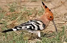 Bustards are large terrestrial birds mainly associated with dry open country and steppes in the Old World. They are omnivorous and nest on the ground. They walk steadily on strong legs and big toes, pecking for food as they go. They have long broad wings with "fingered" wingtips and striking patterns in flight. Many have interesting mating displays.