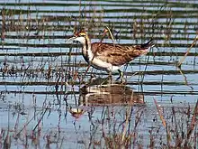 The jacanas are a group of tropical waders in the family Jacanidae. They are found throughout the tropics. They are identifiable by their huge feet and claws which enable them to walk on floating vegetation in the shallow lakes that are their preferred habitat.