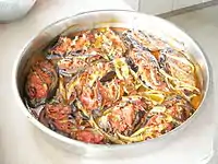 • Tepsi baytinijan – an Iraqi casserole dish[6] consisting of eggplants, which are sliced and fried before placing in a baking dish, accompanied with meatballs, tomatoes, onions and garlic.[7]