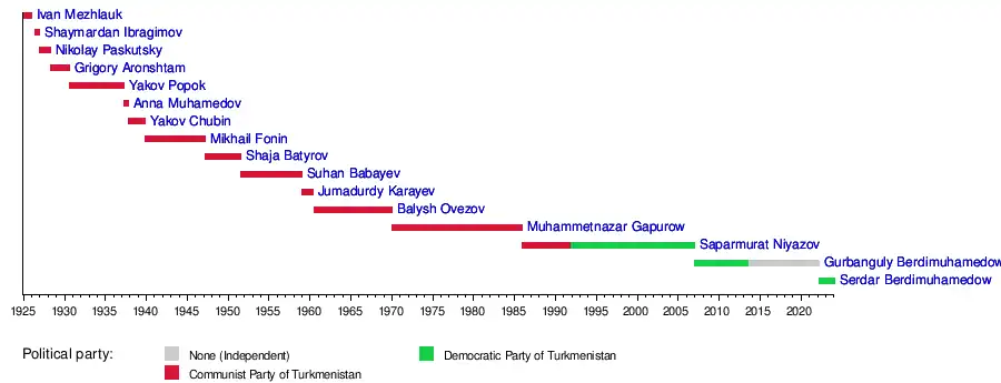 Below is a list of leaders of present-day Turkmenistan since the establishment of Turkmen SSR in 1925.