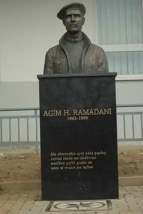 Agim Ramadani (3 May 1964 – April 1999) was an Albanian leader of the Kosovo Liberation Army. He was born in Zhegër of Gjilan. During the war he was a soldier that contributed for freedom in Kosovo. He lived in Prizren, while he was working in Germany. During the war he proved that he was a senior strategist and a good leader for soldiers. It was one of the drafters of the plan for breaking Albanian border, which was something that he accomplished with his peers. He was the first one to pull the stone-pyramid-border Koshare. His conspiracy-name was Katana. He was also qualified as one of the most famous heroes of recent history. Ramadani left behind three descendants, two boys and a girl.[1]