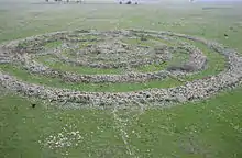 The larger circle, named the “Manza” circle has a diameter of 46 meters, and is the largest stone circle found in Japan. A number of reconstructions of Jomon period dwellings have been built around the site. The slightly smaller circle, named the “Nonakado” circle, is 42 meters in diameter and is located around 90 meters away, separated from the “Manza” circle by Akita Prefectural Route 66. Each circle is made from rounded river stones brought from another river approximately 7 kilometers away. Each circle in concentric, with and inner and an outer ring separated by an open strip approximately 8 meters wide.[16] Each circle contains smaller clusters of stone, including standing stones surrounded by elongated stones in a radiating orientation, forming a sundial which points toward the sunset on the summer solstice and allows for calculation of the winter solstice, the vernal equinox and the sun's movements.[17]