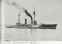 A dark-gray painted warship with two masts, three funnels, and four gun turrets visible at sea