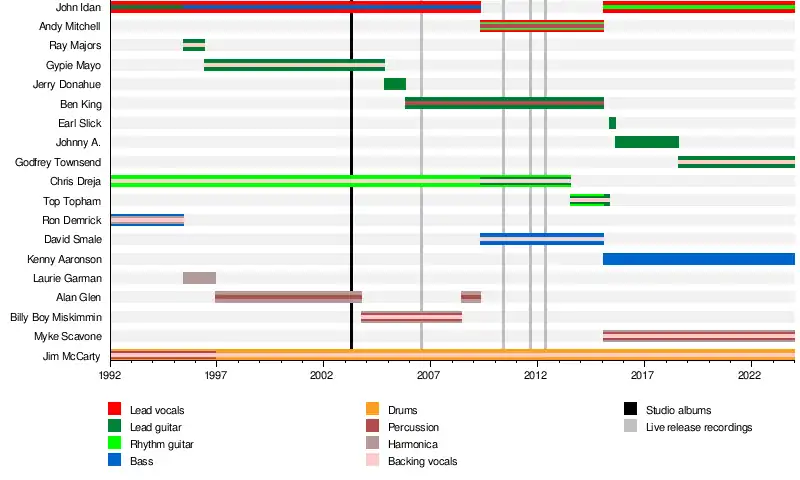 McCarty and Dreja reformed the Yardbirds in 1992, adding new members "Detroit" John Idan (lead vocals, lead guitar) and Rod Demick (bass, backing vocals) from the drummer's eponymous band, months later Demick left the band, Ray Majors joined on lead guitar, and Idan moved to bass.[9] A recording of the Jim McCarty Band featuring Demick and Idan was released under the Yardbirds name as Reunion Jam.[10][9] In 1996, Majors was replaced by Gypie Mayo,[11] and later Garman was replaced by Alan Glen.[12] This lineup remained stable for seven years, releasing the band's first new studio album since 1967, Birdland, in 2003.[13] Shortly after the album's touring cycle, Glen left the Yardbirds and was replaced by Billy Boy Miskimmin.[14] Mayo also left the band at the end of 2004,[15] with Jerry Donahue taking his place.[16][17] Donahue remained for a year, before he was replaced by Ben King.[18]