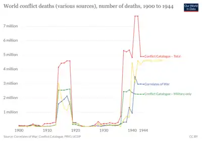 This period saw the outbreak of World War I (1914–1918) and World War II (1939–1945), which are among the deadliest conflicts in human history, with many of the world's great powers partaking in total war and some partaking in genocides. Depending on the source consulted, conflict deaths reached an all-time peak in either 1941 or 1942 at 2.96–7.71 million, during the height of the latter conflict.[1]
