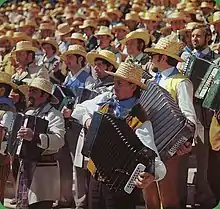 After the restoration of Lithuania's independence in 1990, the Lithuanian Song Festival reverted to its traditional identity and gained the status of a national tradition. The festival is considered to be the unique manifestation of the national culture[5] and the symbol of unity and strength.[6] The song festival's primary parts are Folklore Day, unfolding the geographical and genre diversity of traditional culture, and the Ensembles Night.[7] Lithuanian Song Celebration survives as an ongoing cultural development process. The Celebration includes more than 40 000 participants – both amateur and professional ensembles, artists, also cultural and educational institutions. Consisting of 4 main parts the Celebration usually is held for 7 days. The four main parts are the Folklore Day, which is dedicated to the traditional culture, the Ensembles’ Evening, which is dedicated to folk dance, song and instrumental groups, the Dance Day, presenting massive choreographic compositions, and the Song Day. The distinctive feature of the celebration is singing a cappella. For this the Song Day usually gathers more than 20 000 singers to perform both arranged folk and modern songs of Lithuanian composers, some modern songs being the staple of Lithuanian mass culture. [4]