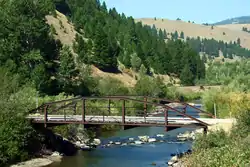 The Little Blackfoot River Bridge in Avon, Montana, is a contributing site to Montana's Historic Steel Truss Bridges, which are listed on the National Register of Historic Places.[32] The bridge, built for $2,540 ($74,209 in 2022 dollars) in 1914 by the O.E. Peppard construction firm, is 61 feet (19 m) long and 16 feet (4.9 m) wide. The bridge is a pin-connected camelback Pratt truss steel bridge. Pin-connected truss bridges are rare, and this is the only such bridge in Montana.[33]