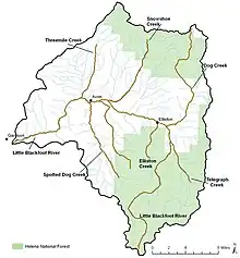 The Little Blackfoot River is located in Powell County, Montana.[2] The river is 48-mile (77 km) long,[3] and its watershed covers 413 square miles (1,070 km2).[4] Its name refers to the Piegan Blackfeet tribe, which frequently visited the area. The first mention of the name was an 1831 entry in a diary kept by John Work, trader for the Hudson's Bay Company. Work implies that the name did not originate with him, but with American fur trappers who had been using the area extensively to hunt beaver for the previous two decades.[5]