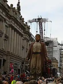 The performance was designed and performed by Royal de Luxe who are based in Nantes, France, alongside locally-recruited participants and volunteers. The performance featured four giant marionettes. A Little Boy and Little Girl giant, an adult giant (the "Castaway") and Xolo the dog. The Little Boy Giant first appeared in a performance in Cameroon and was 6 m (20 ft) high and required 27 People to operate. The Giant Man was 10 m (33 ft) high and required 44 operators.[2] The Little Girl Giant appeared in the previous two Liverpool giant events was not originally billed as being part of the performance but was revealed as a surprise on the Sunday afternoon.[4] Xolo the dog had appeared in the previous two Liverpool Giants performances. The Giants collectively covered a distance of 21 miles (34 km) across Liverpool and, for the first time in such an event across the river Mersey in New Brighton.[5]